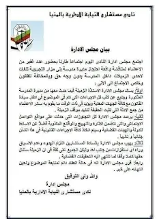 ومن جانبه ، أصدر نادى مستشاري النيابة الإدارية بالمنيا بيان بشأن واقعة احتجاز مديرة مدرسة بني مزار التجريبية لغات لإحدى أعضاء النيابة الإدارية داخل المدرسة بدون وجه حق وبالمخالفة للقانون وخلص الاجتماع إلى الآتي :