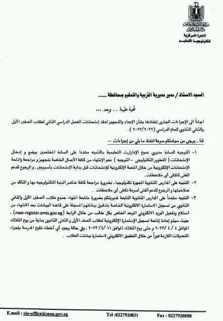 وحصل " أخبار التعليم اليوم " على صورة من الخطاب الصادر ، والذي جاء نصه : " ايماءًا إلى الإجراءات الجاري اتخاذها بشأن الأعداد والتجهيز لعقد امتحانات الفصل الدراسي الثاني لطلاب الصفين الأول والثاني الثانوي العام 2023 .. يرجي اتخاذ الآتي :